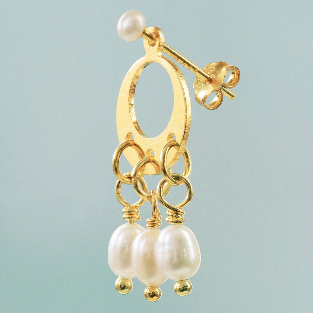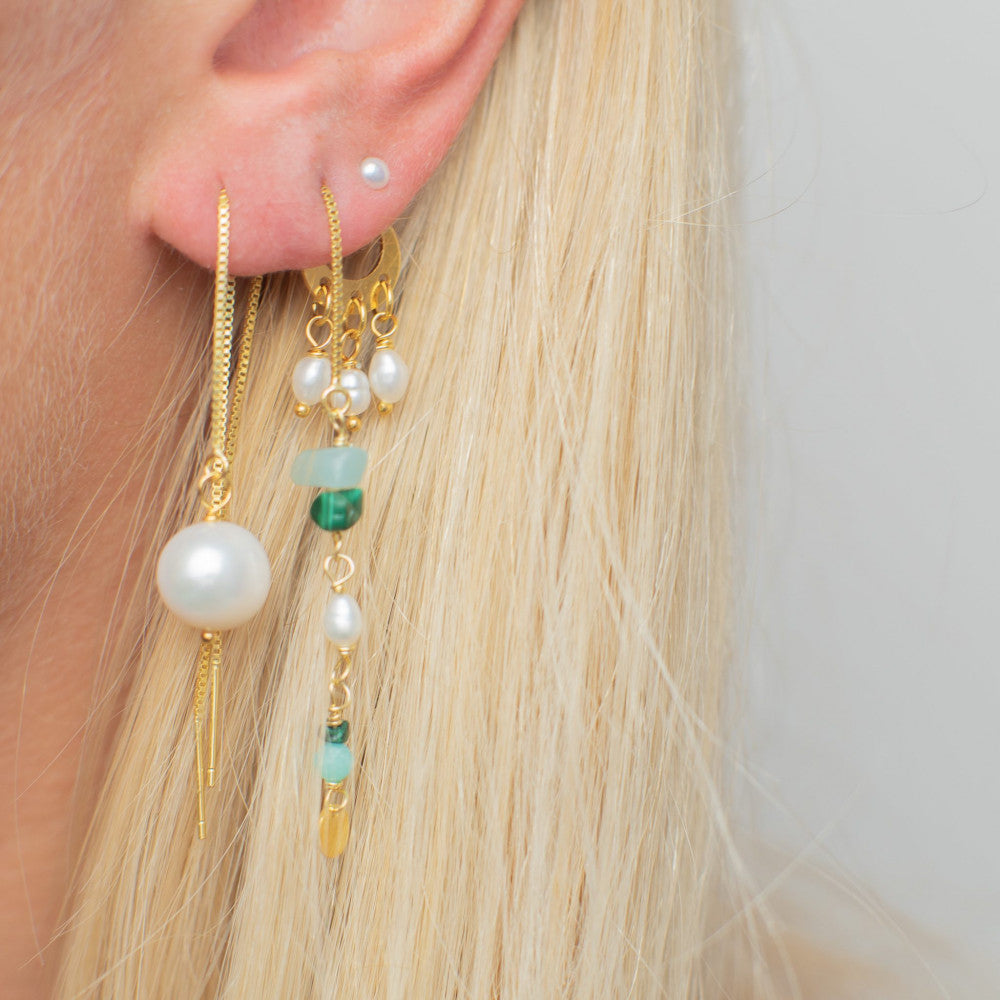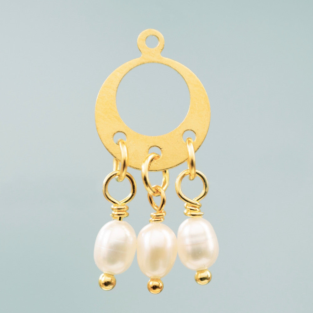 The Behind Ear design is an elegant accessory crafted to be placed behind a stud earring, sitting at the back of the earlobe. This unique piece features a round plate and three dangling pendants adorned with small freshwater pearls.