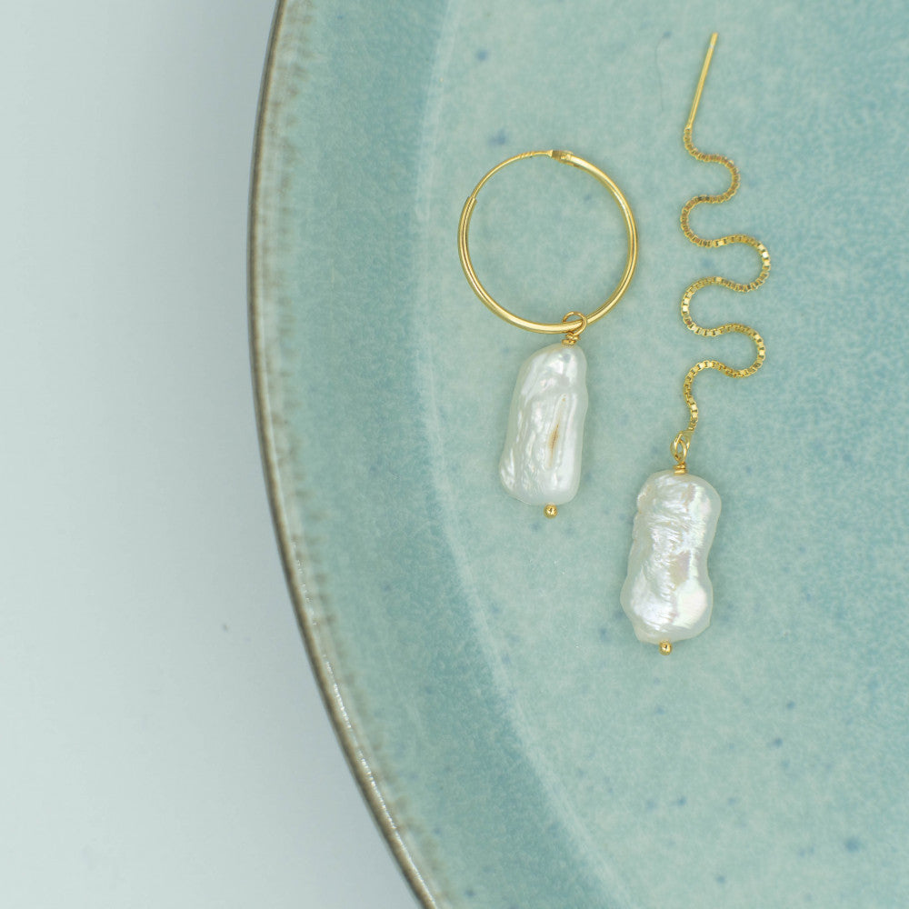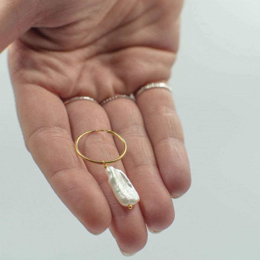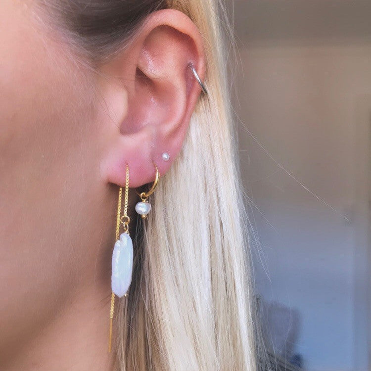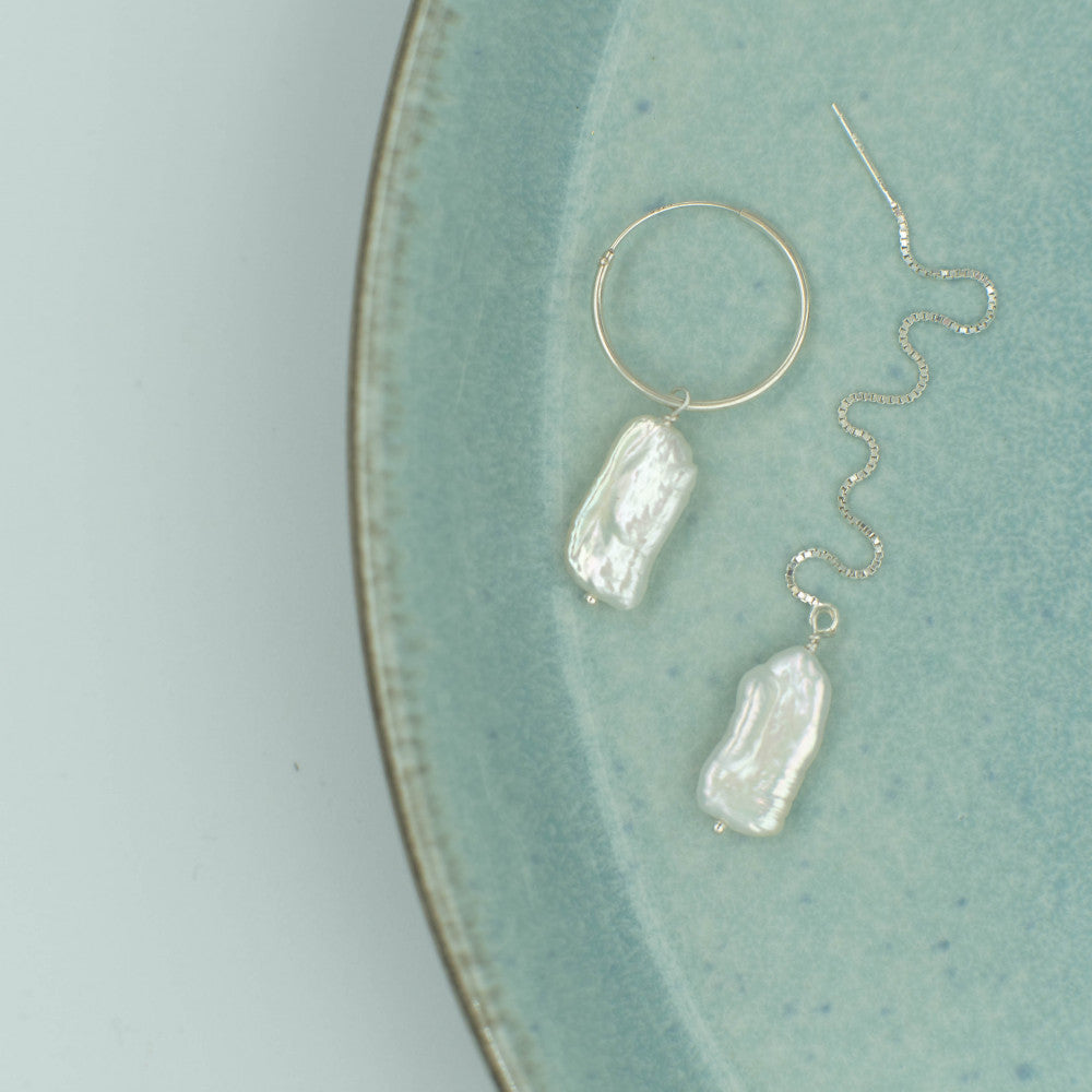 The Biwa Chain showcases a large, exquisite Biwa freshwater pearl at the end of its chain earring, also mounted on a delicate 20 mm hoop. These earrings exude a simple and timeless elegance, perfect for any occasion where you desire to wear sophisticated earrings.