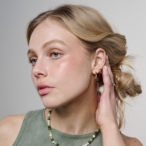 The Bubble Hoop is a charming earring featuring a beautifully colored jade stone and a delicate, loosely hanging chain. The jade stone is available in blue, pink, and purple.