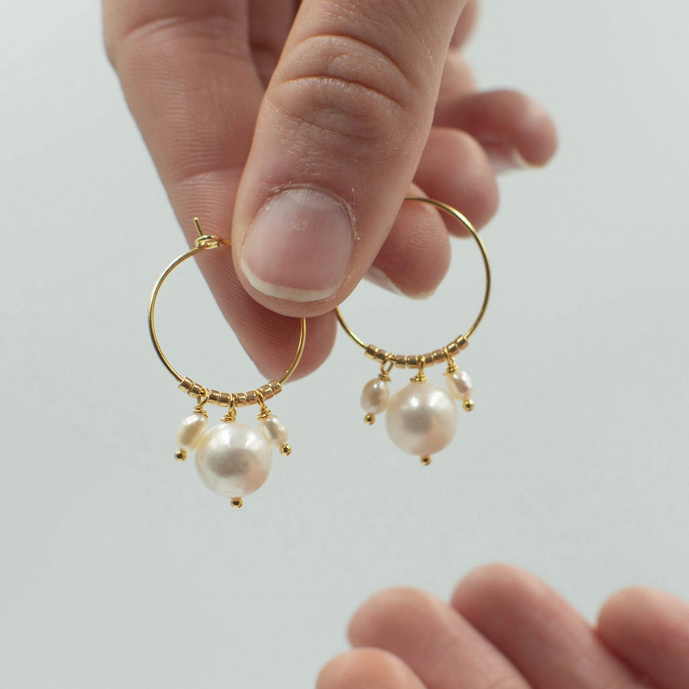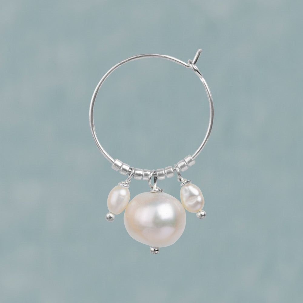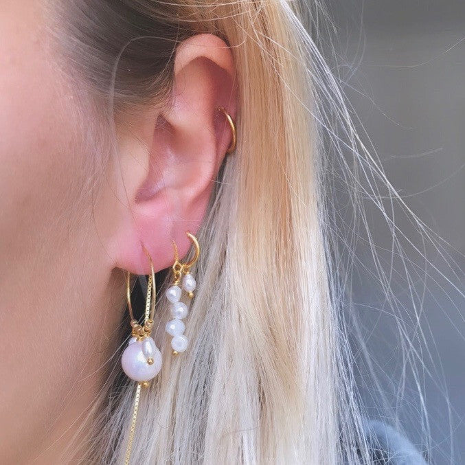 In the picture, the Freshwater Pearl Hoop is worn along with our Pearly Chains finished with our popular Second Hoops.