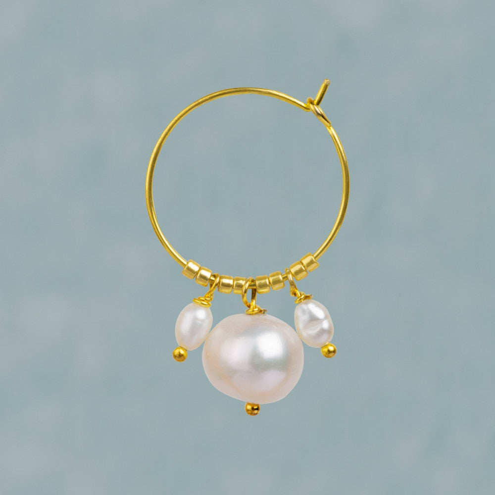 The Freshwater Pearl Hoop is a classic earring consisting of a hoop with three freshwater pearls in two different sizes. The earring has a simple and elegant look and is therefore suitable for any occasion as well as in combination with other of our designs.