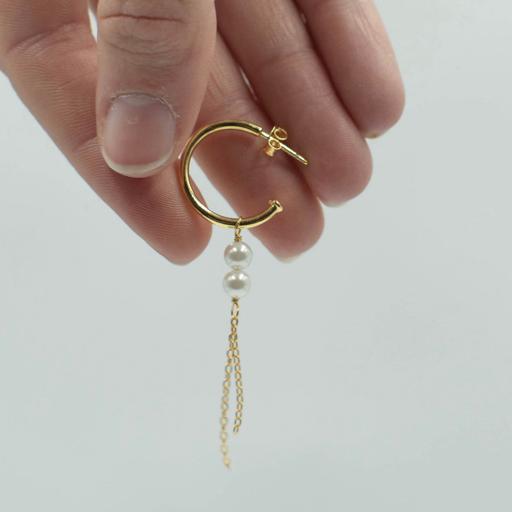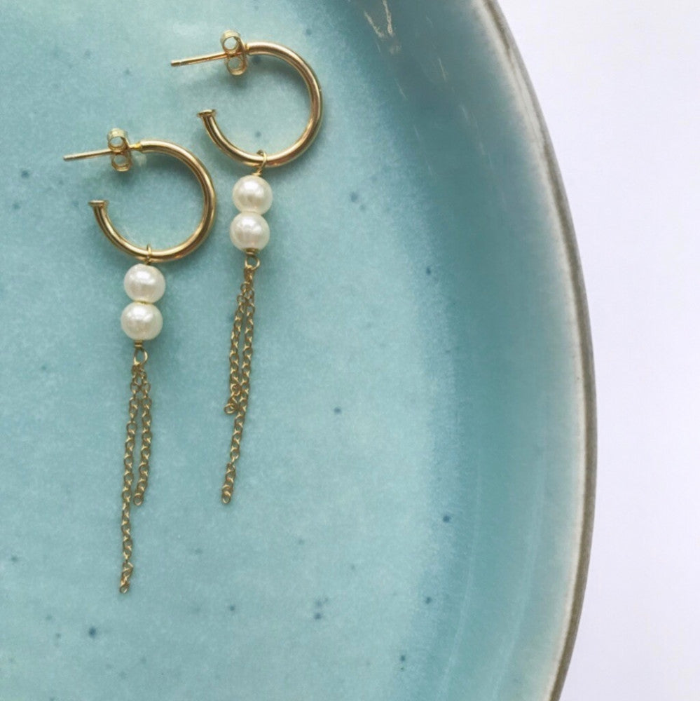 Our Martha Hoop is a nice earring in a chunky half-creole, finished with two freshwater pearls and two loosely hanging chains of varying lengths. These earrings have a little twist from the otherwise traditional pearl earring. The design makes them very elegant and suitable for any occasion.