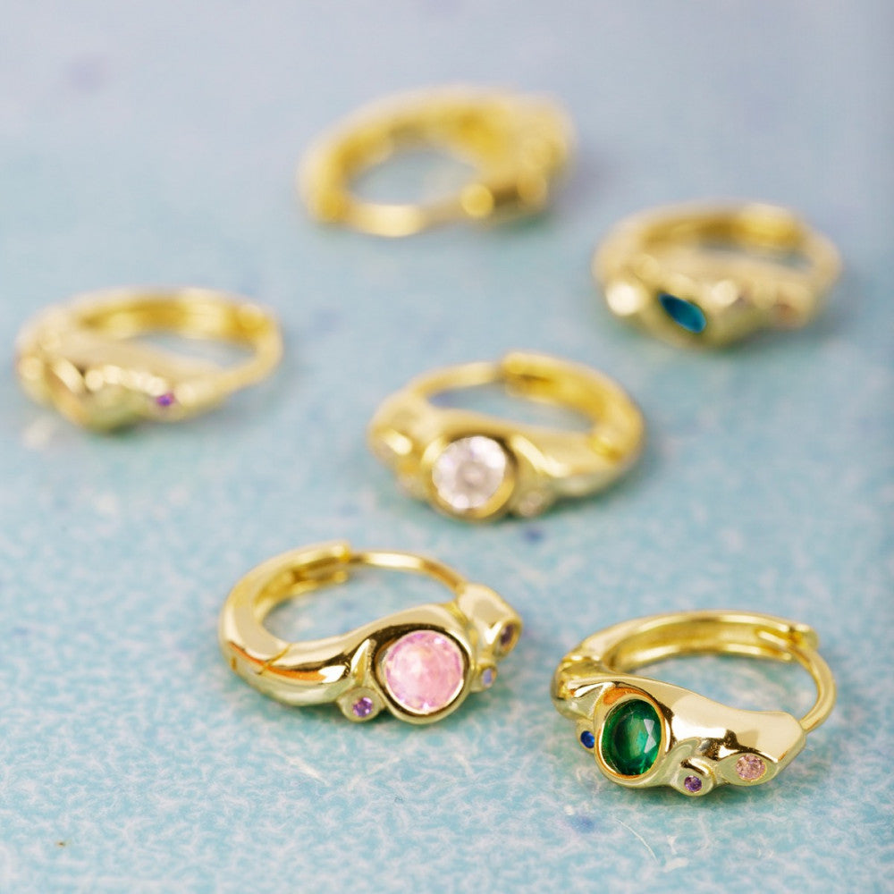 Available in 4 different color combinations: Clear, Pink/Lilac, Blue-Green, and Green/Mix, the hoop itself is crafted from either 18k gold-plated silver or 925 sterling silver.