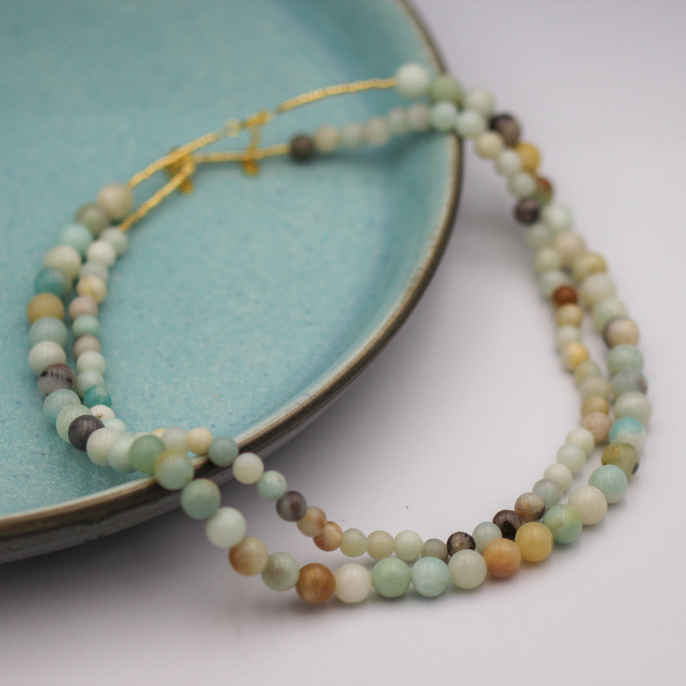 Amazonite has beautiful natural colors that range from a light turquoise to brownish and greyish shades. We have fallen head over heels for this stone and have therefore chosen to make these beautiful necklaces.