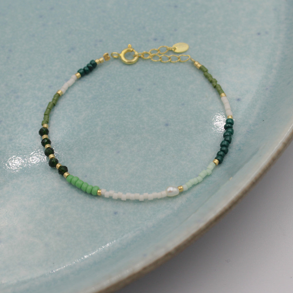 Introducing the Bracelet // Mixed Green, our latest bracelet design featuring a profusion of exquisite Miyuki Delica pearls in a lush green hue. Complementing these pearls are a diverse array of agates, small freshwater pearls, and gold pearls, creating a captivating mix.