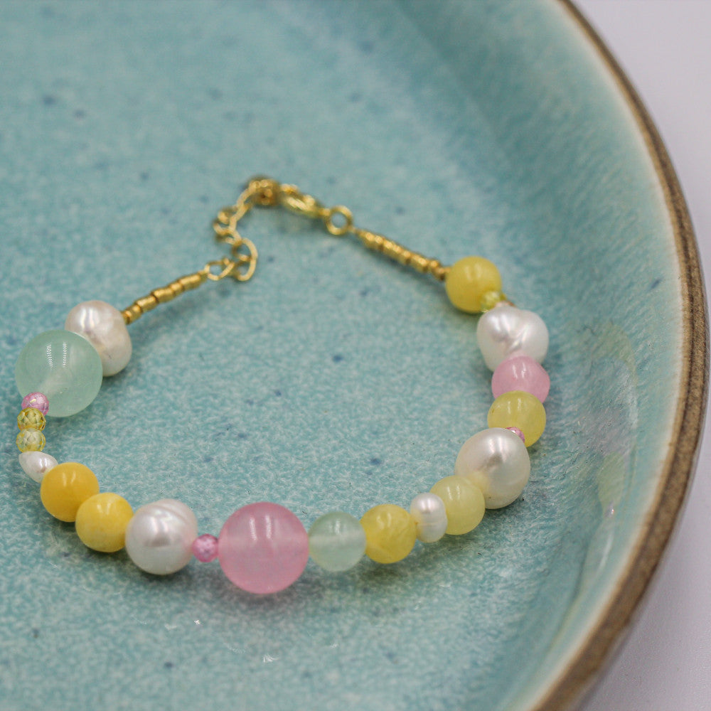 Bubble Bracelet is a beautiful bracelet with lots of colors and joy! We have played with the beautiful pastel colored jade stones and combined them with the beautiful freshwater pearls.