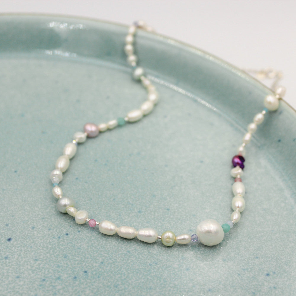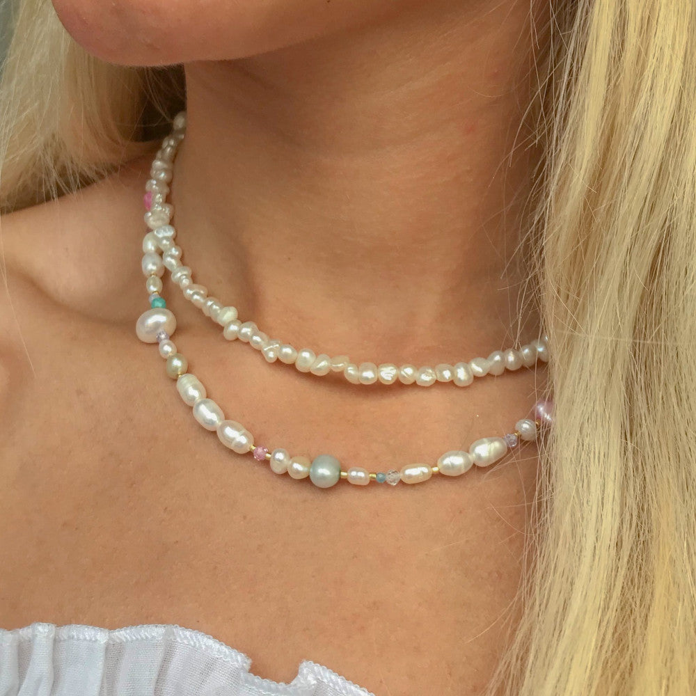 The necklace is designed with a combination of natural freshwater pearls and beautifully colored jade stones. Each freshwater pearl is unique in size, color and appearance, creating a beautiful and varied whole. To complete the colorful look, the necklace is adorned with Miyuki Delica pearls and sparkling zirconias.
