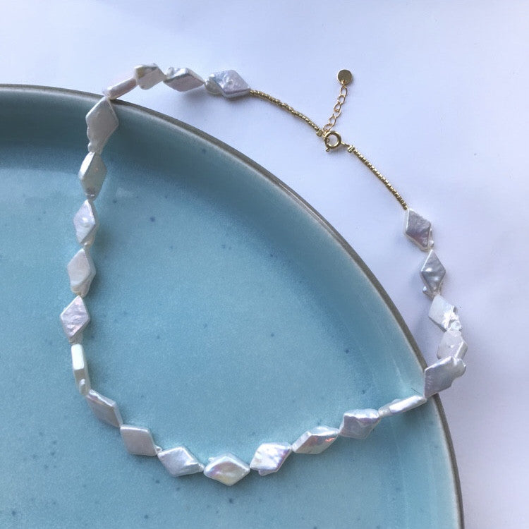 The Harlequin Necklace is a timeless piece featuring harlequin-shaped freshwater pearls, interspersed with delicate Miyuki Delica beads. This necklace exudes an exclusive elegance, making it perfect for special occasions. It can also be beautifully paired with our other designs.