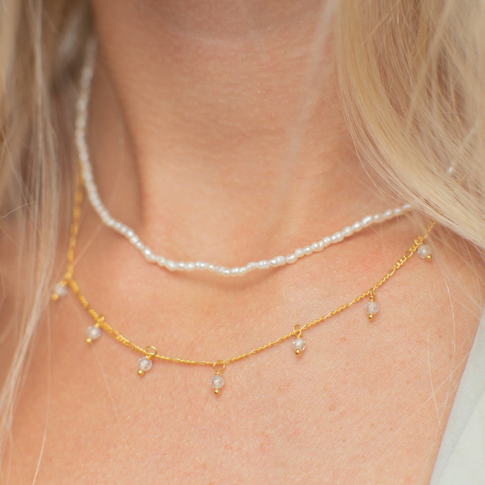 In the image, the Krystal Necklace is paired with a 39 cm Tiny Pearl Necklace. You might also like our Windy Necklace // Figaro, which incorporates freshwater pearls, and the matching Crystal Bracelet.