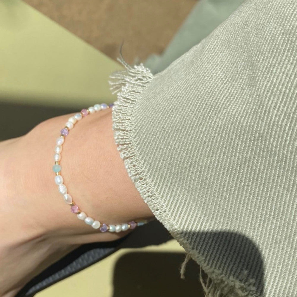 The Lolly Anklet is our fine ankle chain with a mix of classic freshwater pearls and colorful zirconia stones. It is the perfect summer anklet to add a pop of colour to your outfit! It can worn alone or together with our other designs.