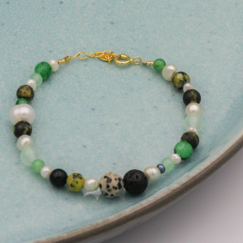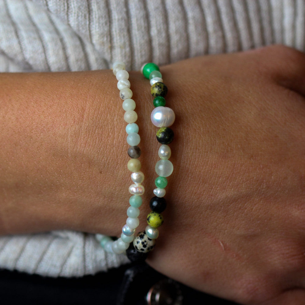 In the bracelet you will find, among other things, Amazonite, Jadestone, Lava pearls, Freshwater pearls and Dalmatian jasper.