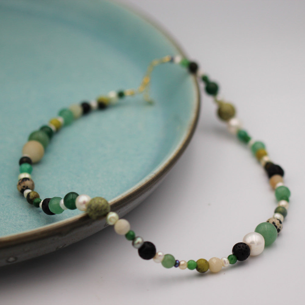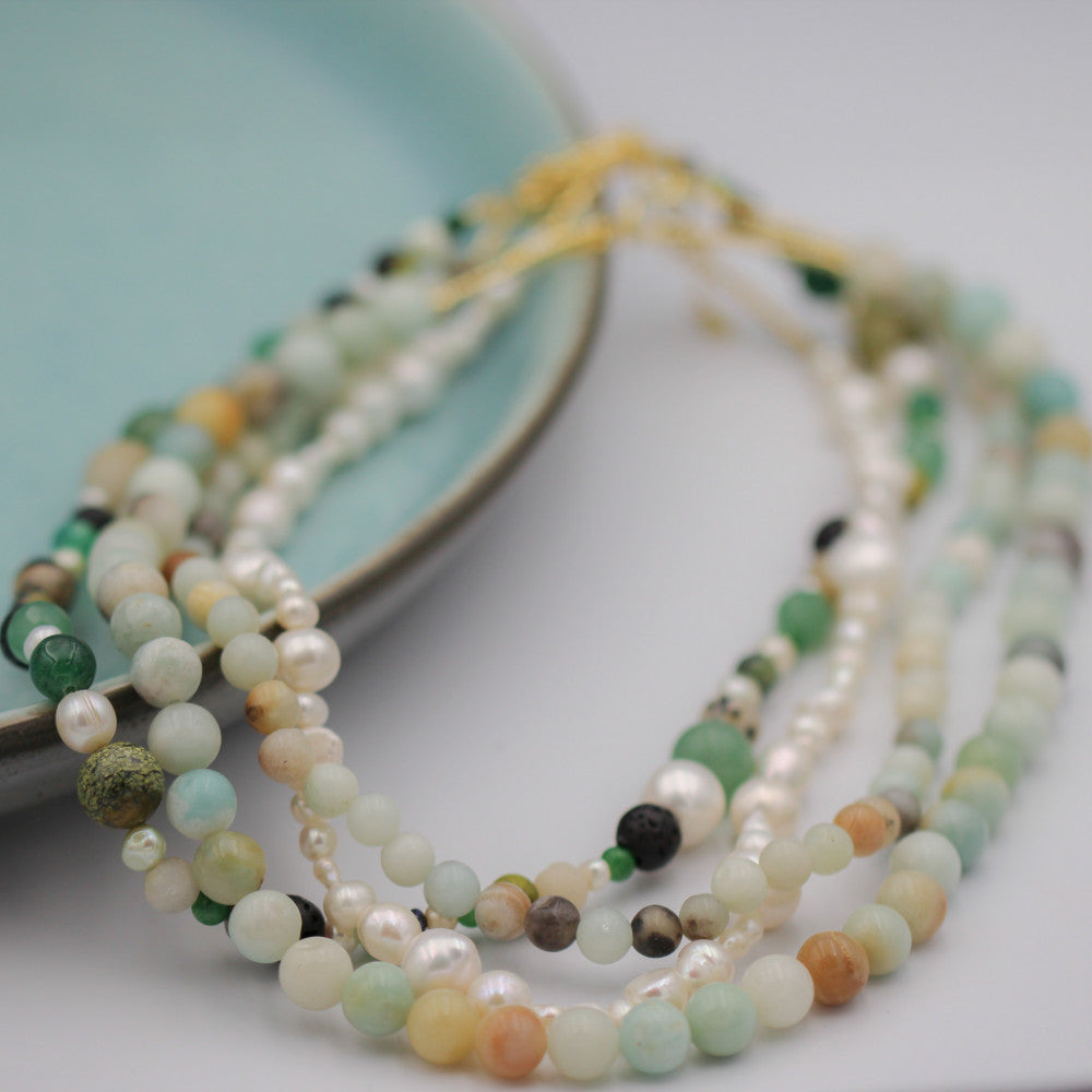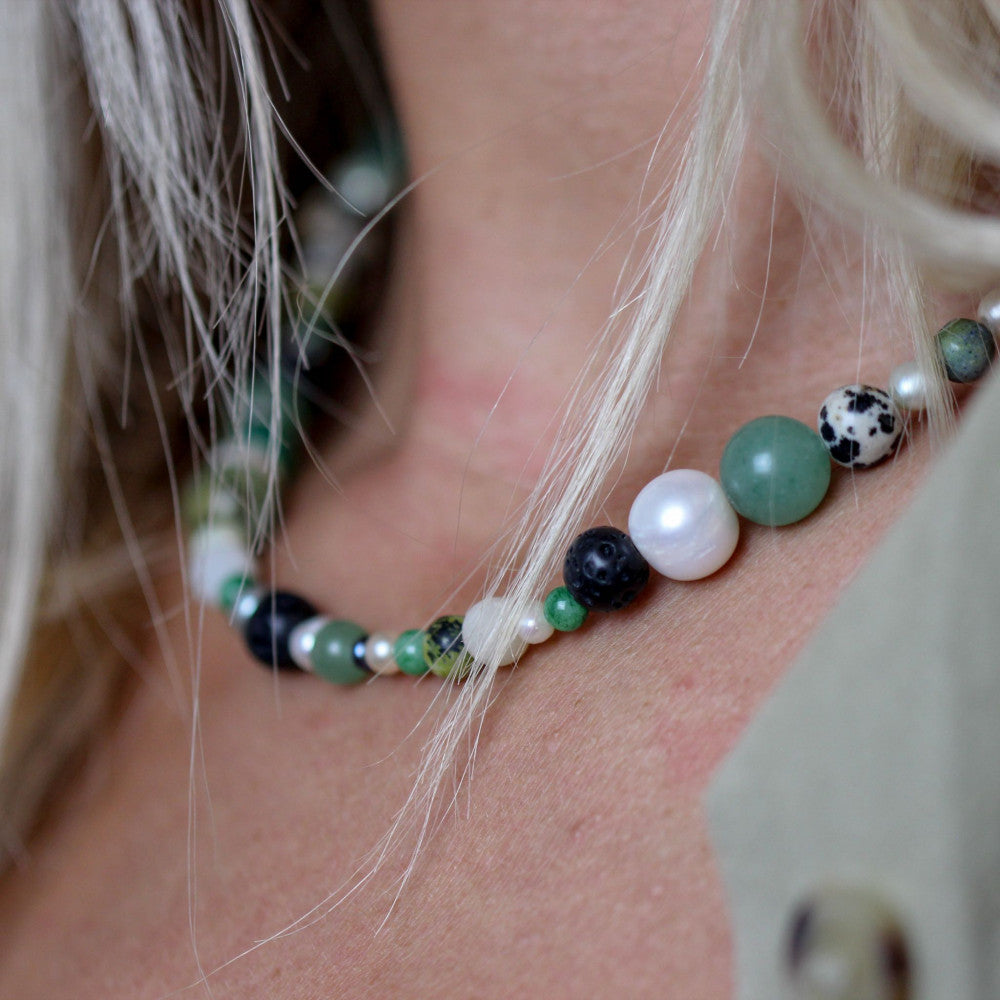 The necklace contains, among other things, Amazonite, Jadestone, Lava Pearls, Freshwater Pearls and Dalmatian Jasper.