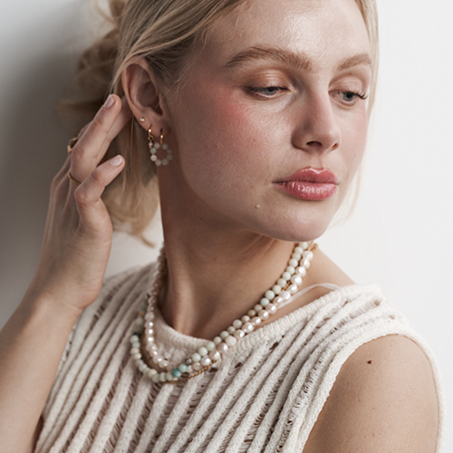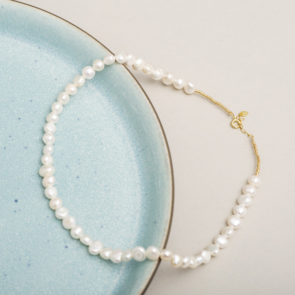 The Pearly Necklace Large offers a classic design featuring medium-sized freshwater pearls arranged in a long row, interspersed with delicate Miyuki Delica beads at the end. This necklace exudes elegance, lending an exclusive touch to any outfit. Personally, I always wear one of our pearl necklaces when attending parties or more formal occasions.