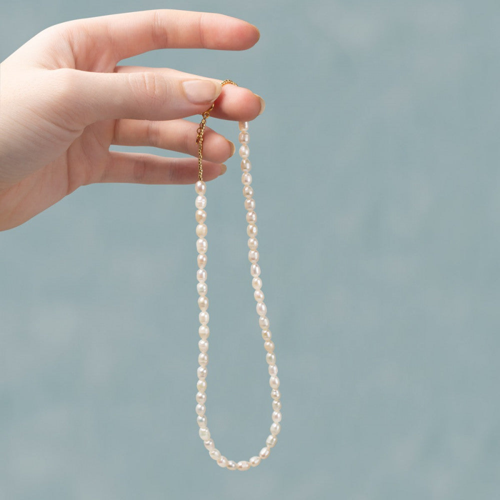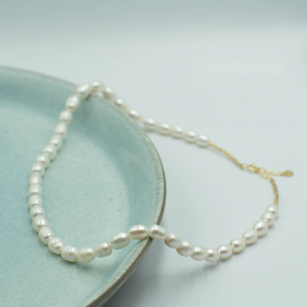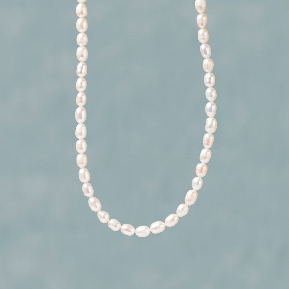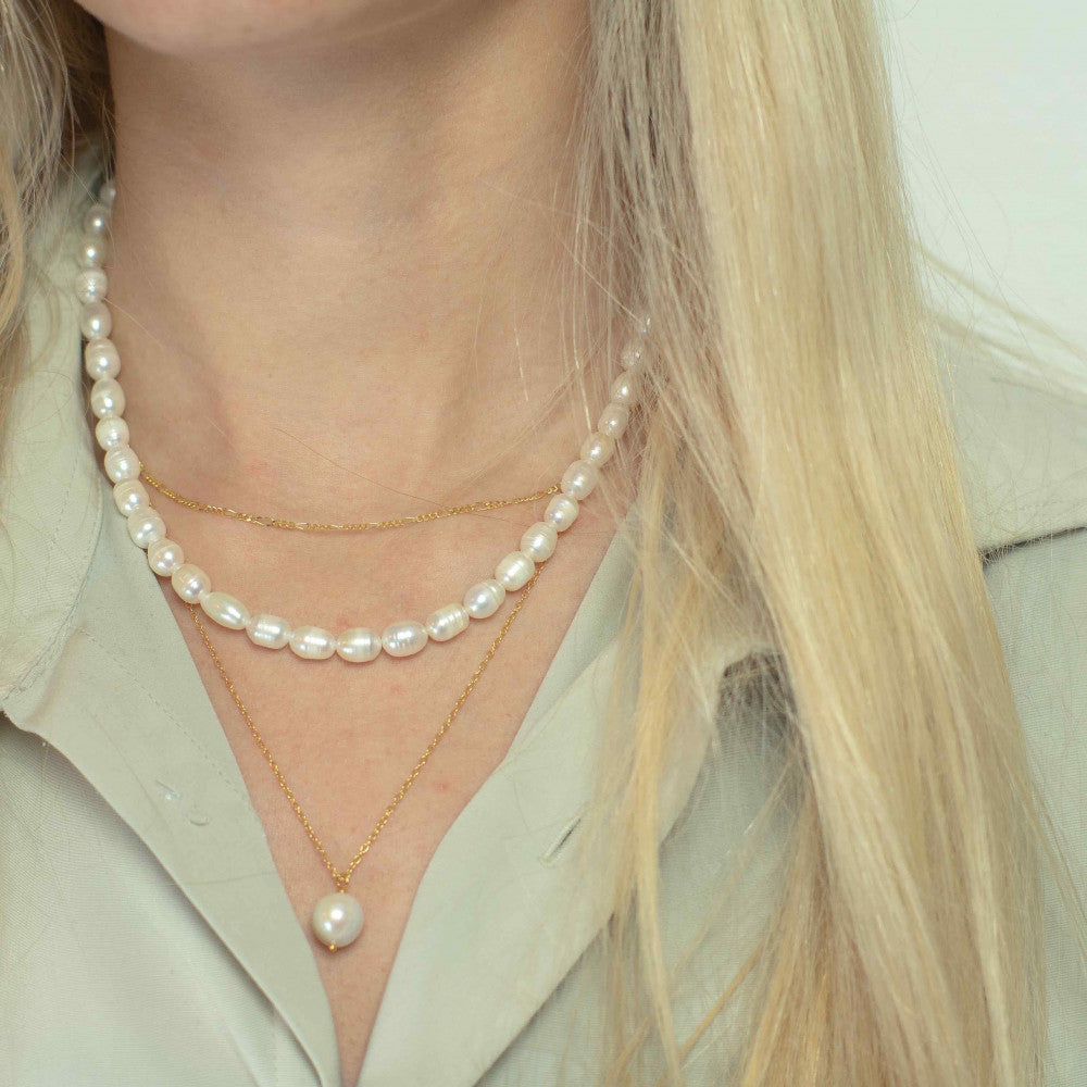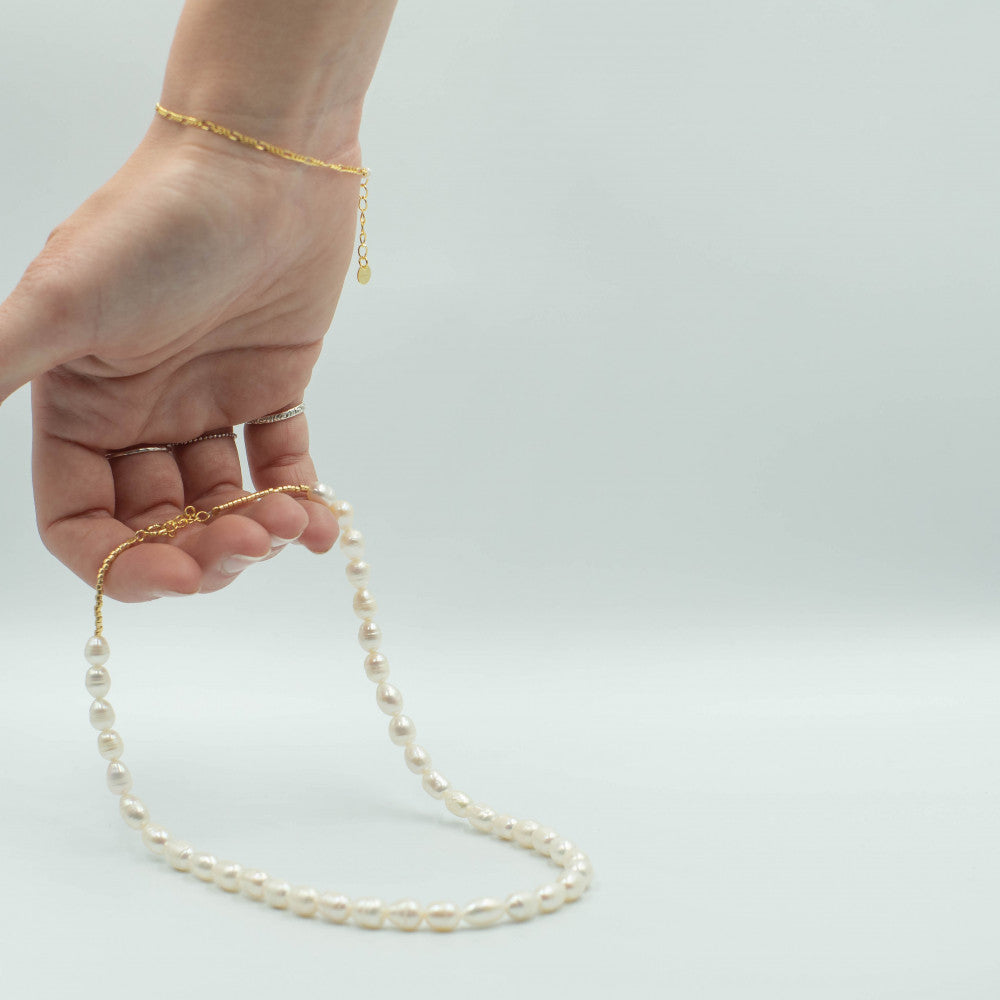 The Pearly Necklace Medium-Large is a classic necklace featuring medium-sized freshwater pearls arranged in a long row, interspersed with delicate Miyuki Delica beads at the end. This is a highly elegant necklace that will add an exclusive touch to any outfit. Personally, I always wear one of our pearl necklaces when I attend a party or a more formal event.
