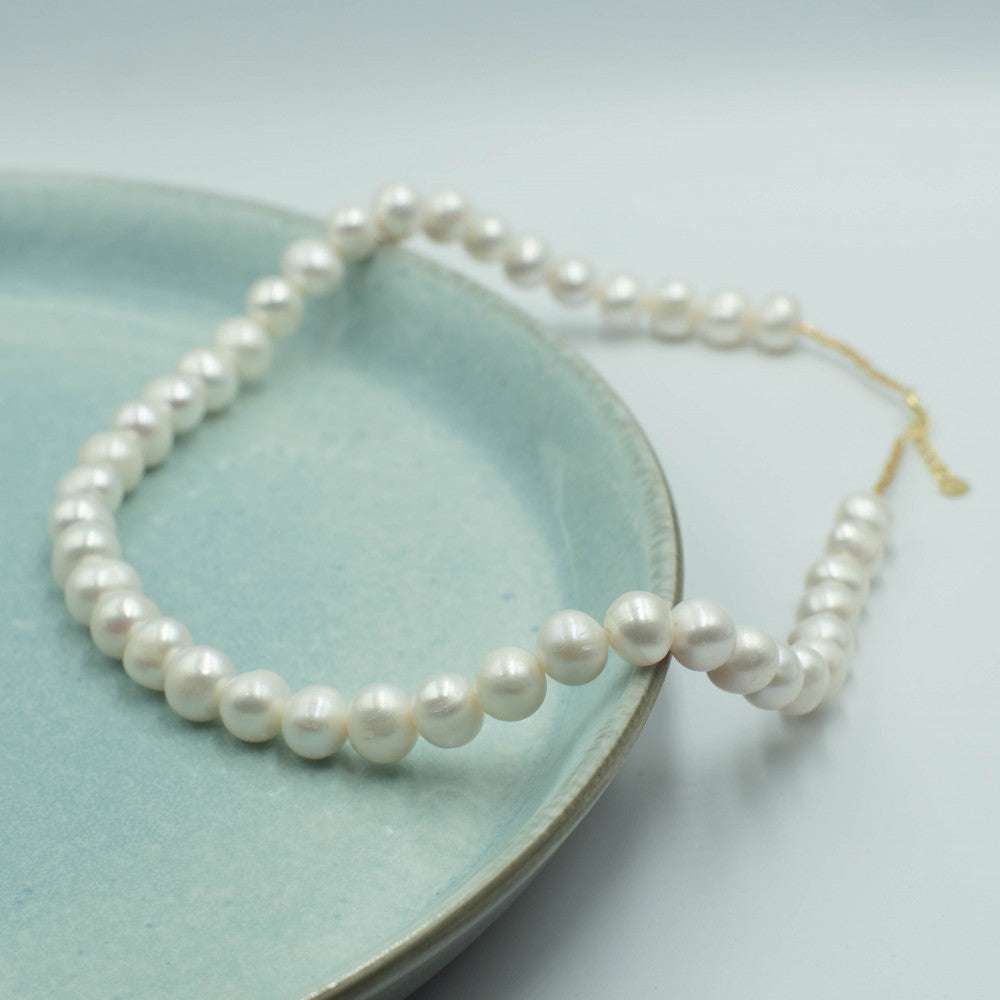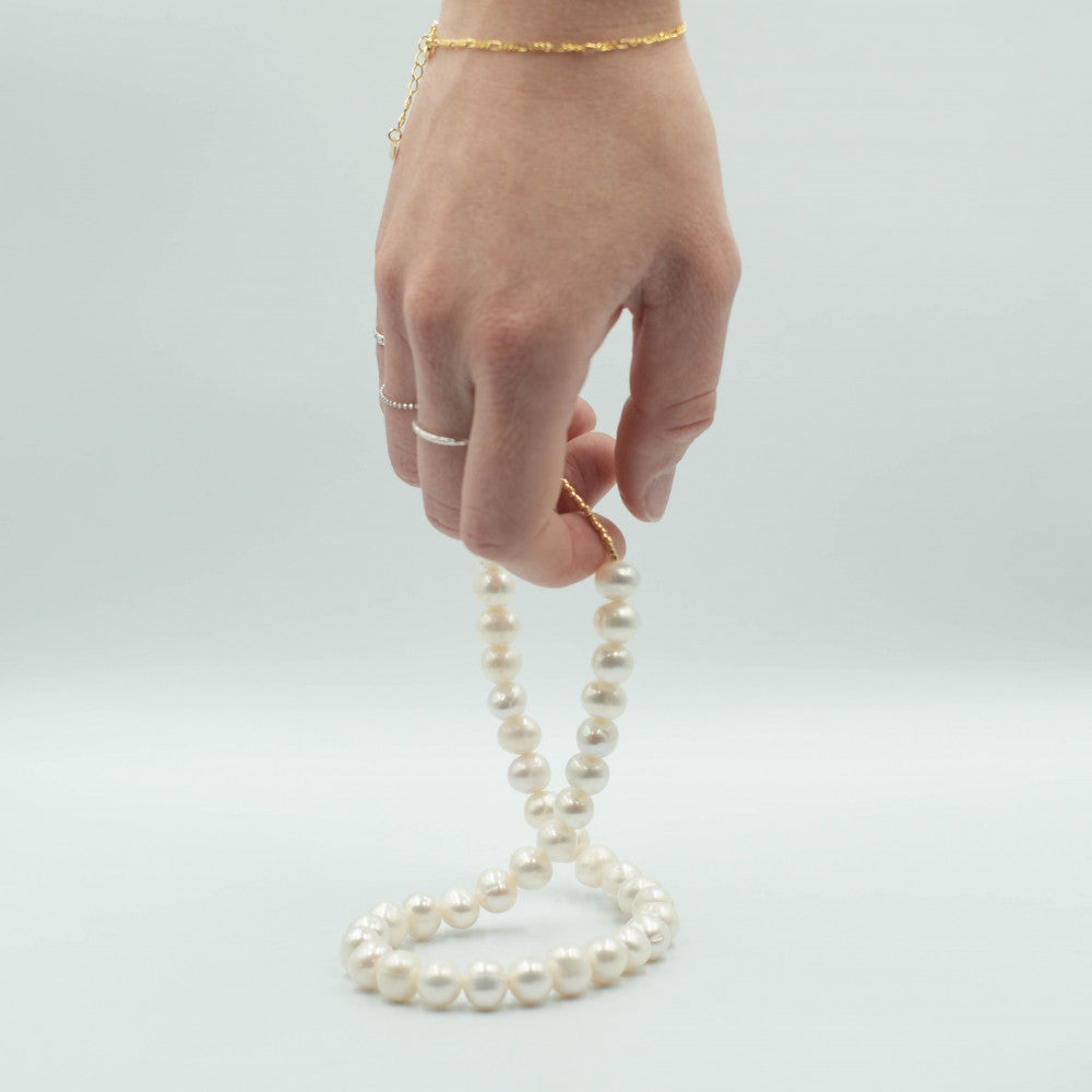 Pearly Necklace Large is a classic necklace adorned with medium-sized freshwater pearls arranged in a long row, interspersed with delicate Miyuki Delica beads at the end. This necklace exudes elegance and adds an exclusive touch to any outfit. Personally, I always wear one of our pearl necklaces when attending a party or a more formal event.