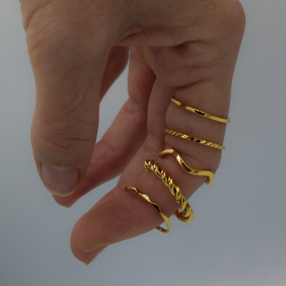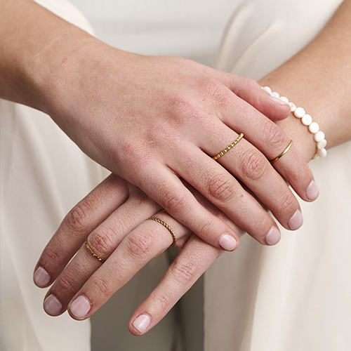 In the picture, the Bubble ring is worn on the index finger and the Plain ring on the ring finger of the front hand. On the back hand, the Small twisted ring is worn on the ring finger and the Grooved ring on the middle finger.