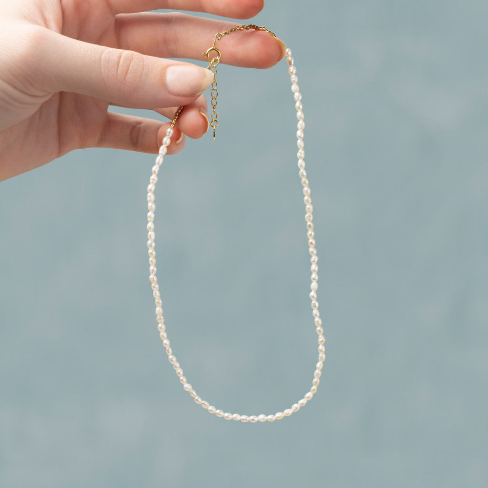 Tiny Pearly Necklace is a classic and stylish necklace with small freshwater pearls of 2-3 mm that sit nicely on a chain. The necklace is very simple and can be worn together with other pearl necklaces, but also works really well on its own if you want a little twist to your outfit.