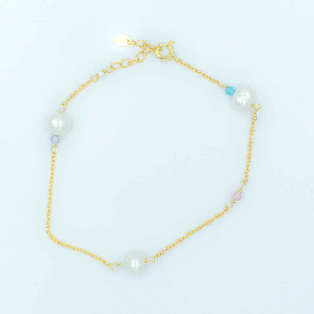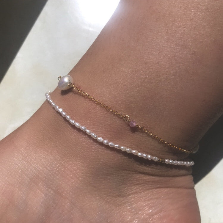 In the photo, the Summer Anklet is showcased alongside a Tiny Pearl Anklet.