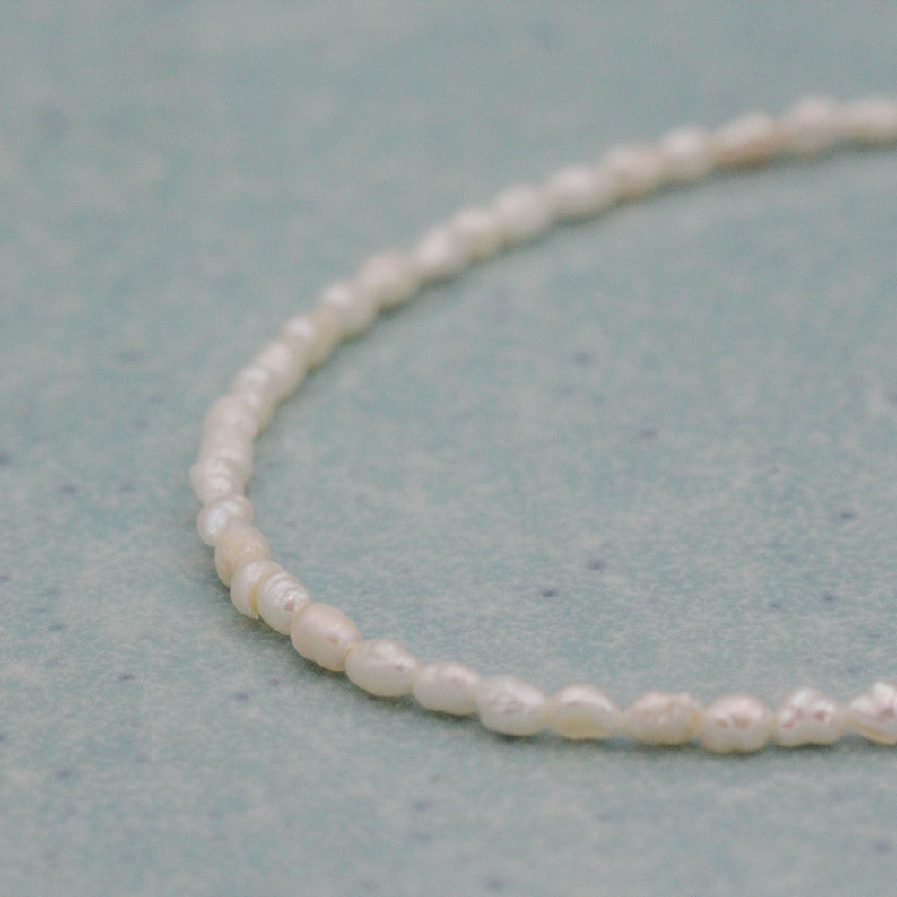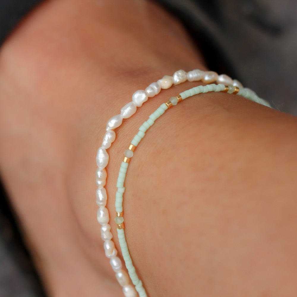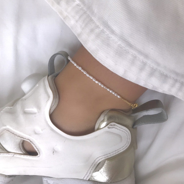 The Tiny Pearl Anklet is an elegant ankle chain with small freshwater pearls that are broken by fine Miyuki Delica pearls. Mother of pearl from the freshwater pearls looks fantastic on summer brown legs.