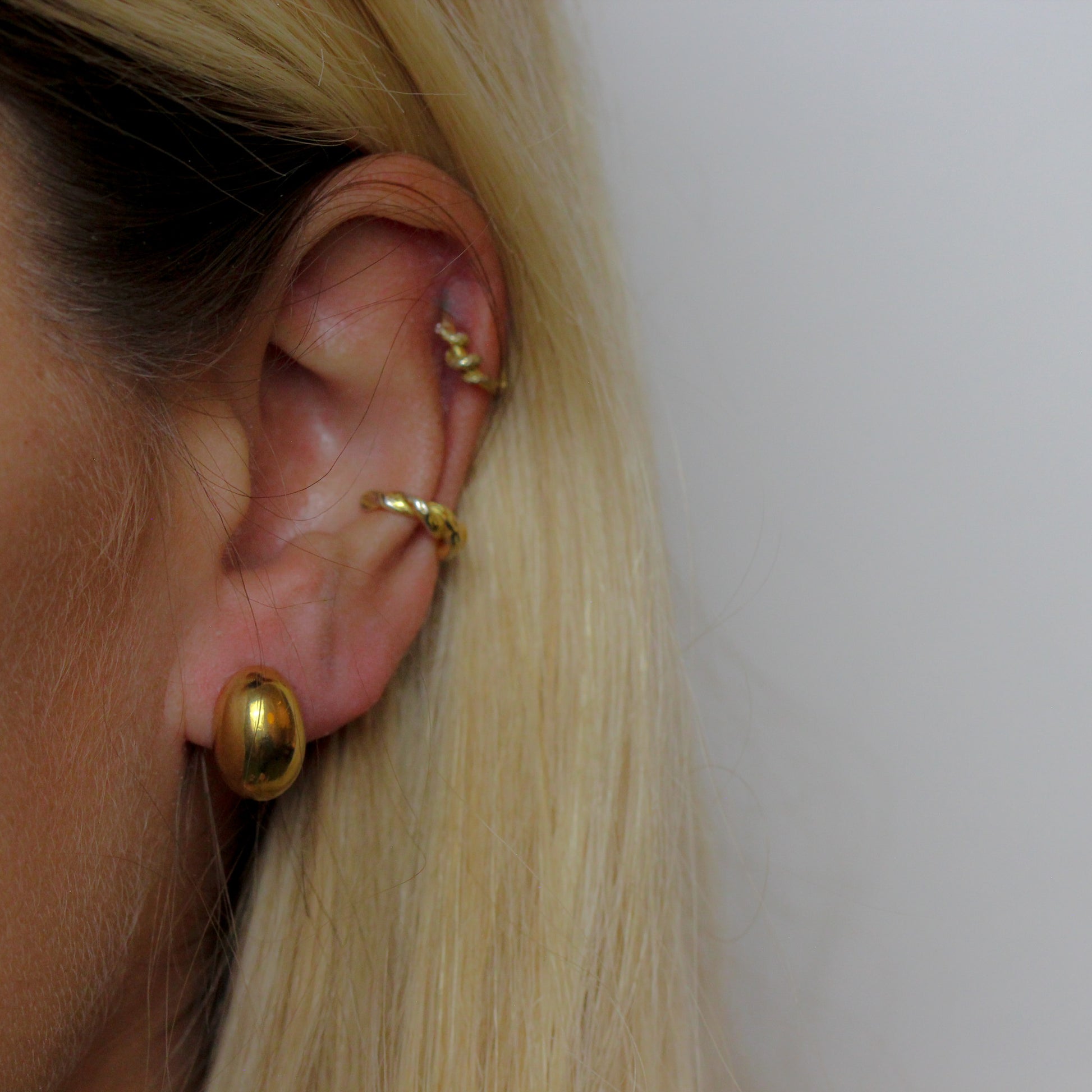 Øreringen er lavet i 18k forgyldt ædelstål (samme materiale som vores fingerringe). Dette materiale er et helt rent materiale, som guldet binder til. Derfor er disse smykker meget mere slidsstærk end forgyldt sølv, og er derfor også det som man kalder for vandfaste smykker.