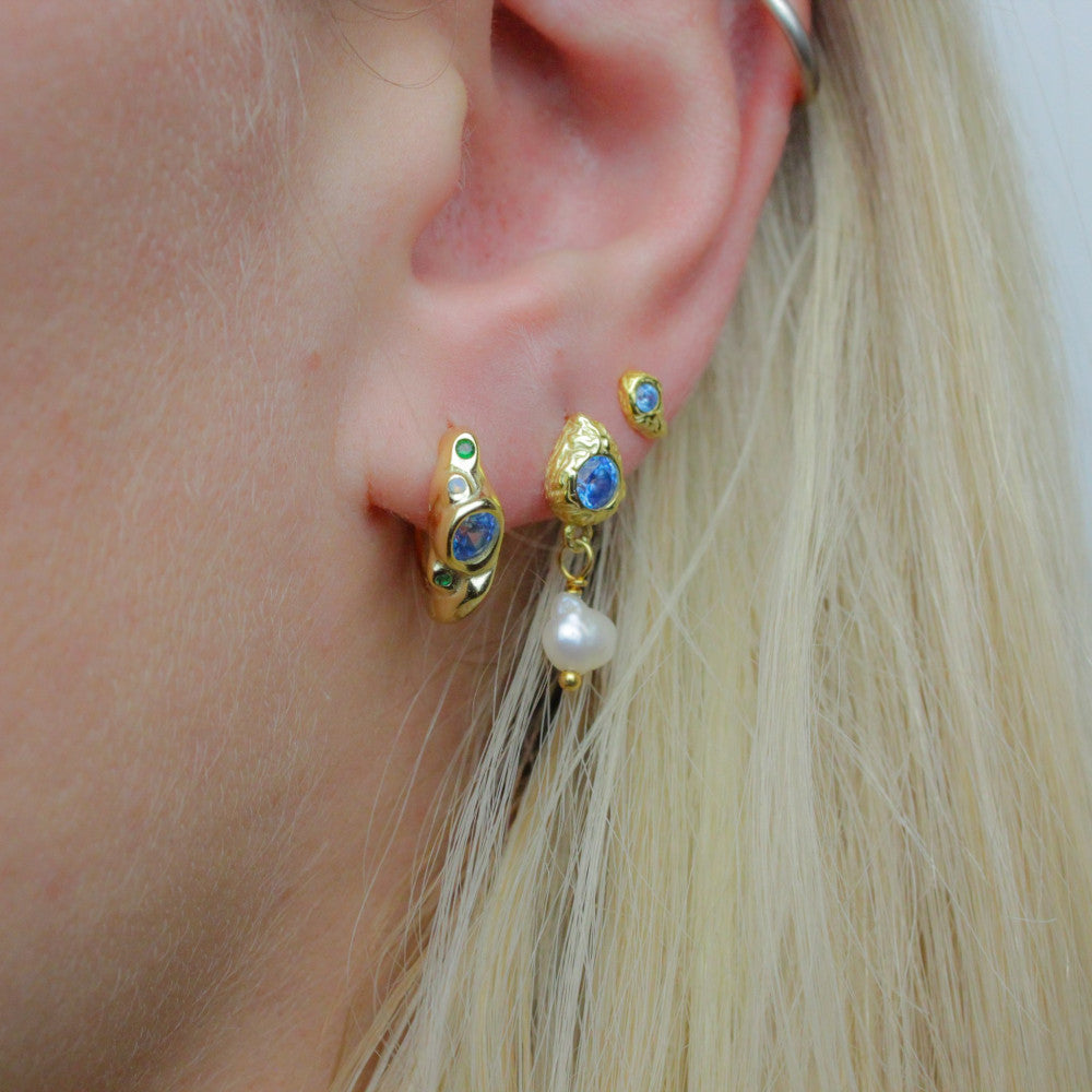 Se hvordan modellen ser ud i øret på den andet billede - OBS! øreringen er i Sølv og med lyserød selvom at den på billedet er i guld og blå (Denne er udsolgt).