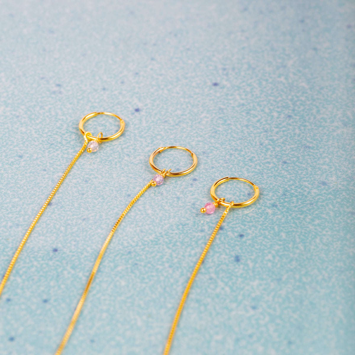 Lolly Hoop er en fin og feminin hoop-ørering, der kombinerer et enkelt design med elegante detaljer. Øreringen består af en 13 mm hoop, dekoreret med en funklende zirkonia og en lang, let kæde, som tilfører bevægelse og et sofistikeret udtryk.
