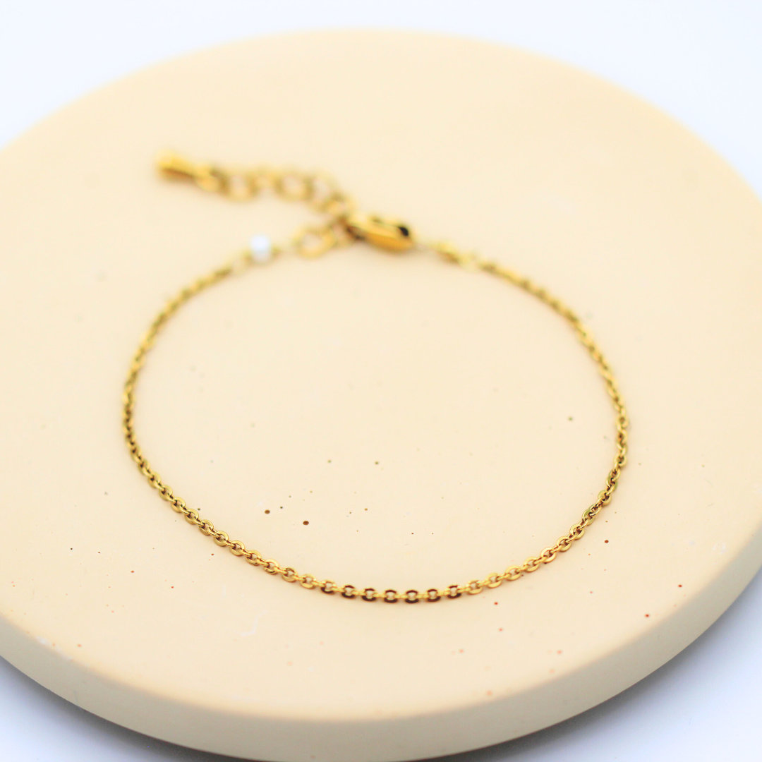 Armbåndet er lavet i 18k forgyldt ædelstål (samme materiale som vores fingerringe), og er derfor en del af vores Waterproof-kollektion. Dette materiale er et helt rent materiale, som guldet binder til, og derfor bliver mere slidstærk en 18k forgyldt sølv. Derfor kalder man smykker lavet i 18k forgyldt ædelstål for vandfaste smykker, som holder sig smuk selv ved daglig brug.