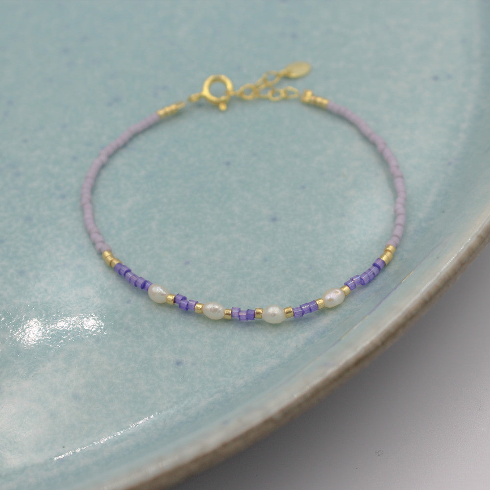 Bracelet // Pearl Lila er vores fine armbånd der som base har en masse flotte lila Miyuki Delica perler der bliver opdelt med fire ferskvandsperler på fronten.
