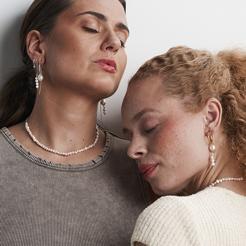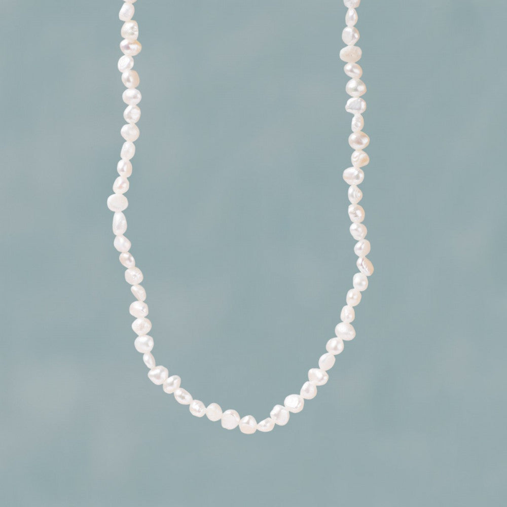 Pearly Necklace er en klassisk halskæde med fine rustikke ferskvandsperler. Ferskvandsperlen på denne model er flade og ujævne, der giver den et rustikt. Langs perlehalskædens lås sidder der en række Miyuki Delica perler.