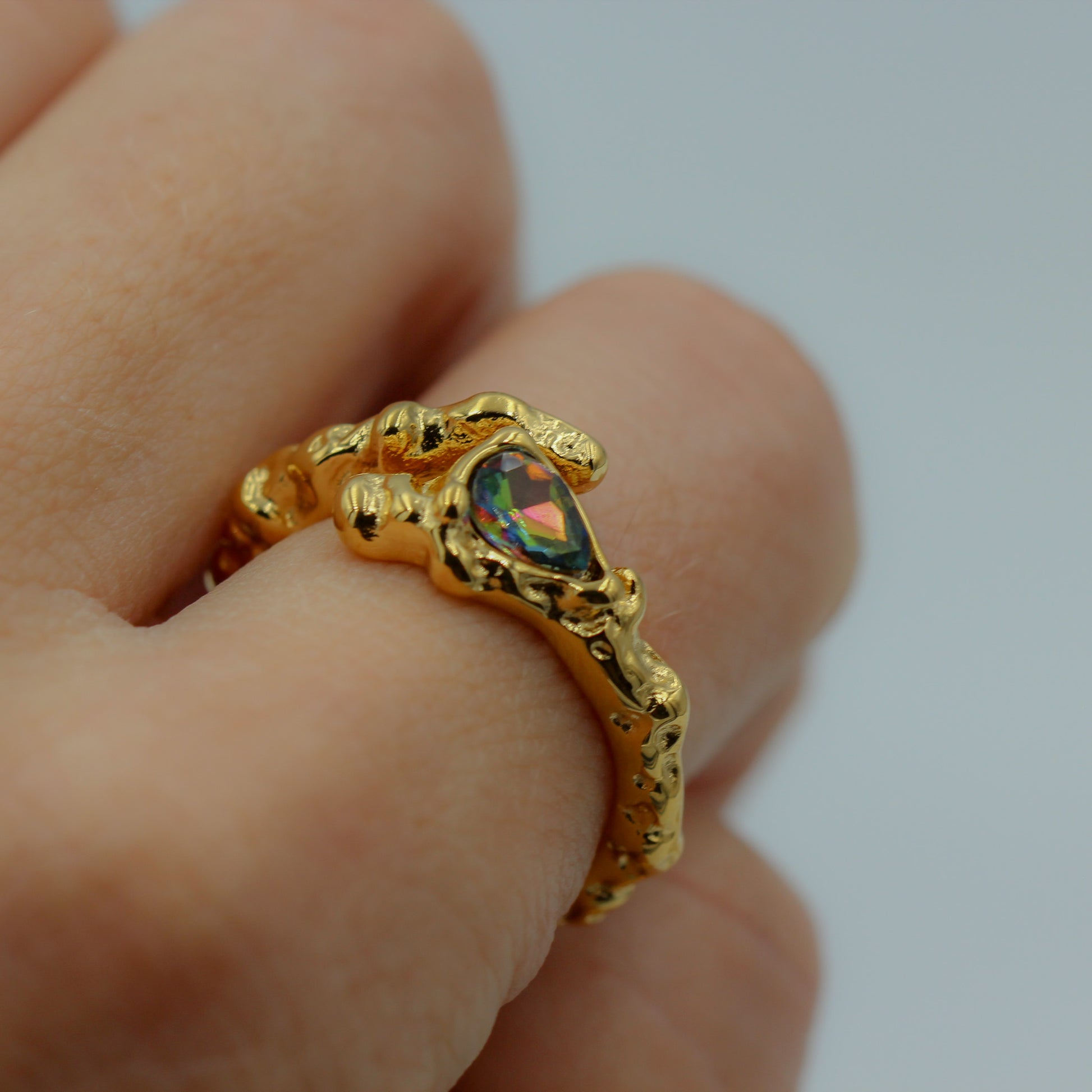 Vores Mystic Wave Ring, er en smuk vandfast fingerring med en organisk, bølgende struktur med en iøjnefaldende sten. Stenen fås i en dyb grøn farve, og i en mørkere changerende sten som skifter farve i lyset.