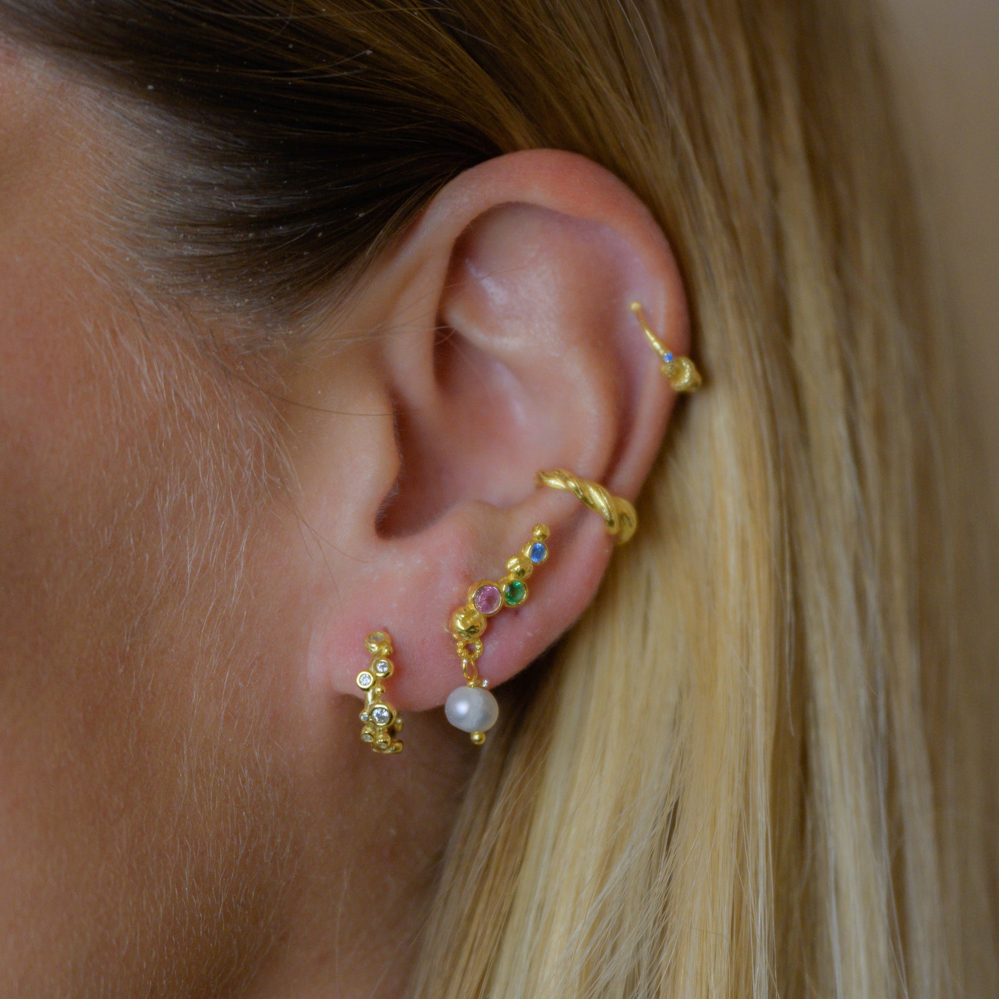 På billedet ses en sammensætning af vores fine nye Crystal Hoop, en Crystal Wing og en Chunky earcuff.
